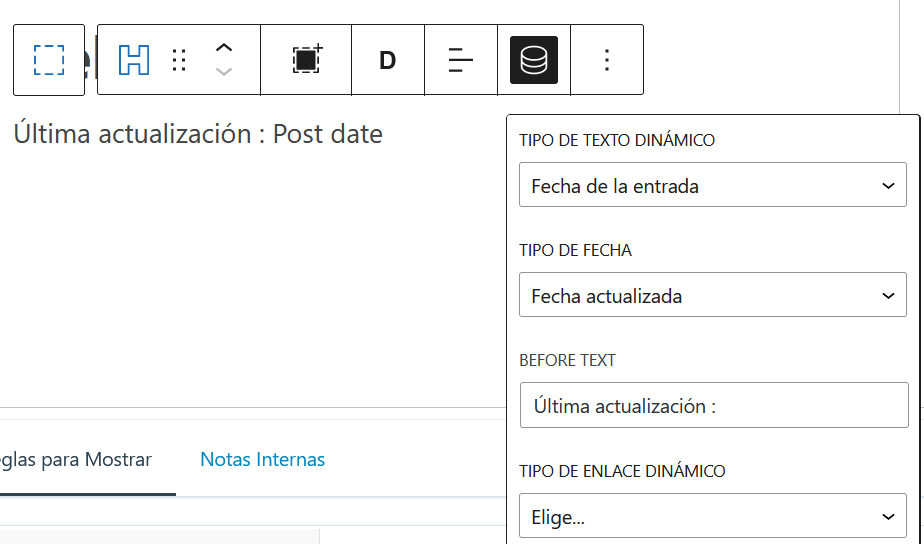 Y luego dentro de tu Page Hero, donde quieras crear un Heading e escribir la función Post Date para utilizar las opciones dinámicas (el cuadrado negro en la imagen). Tipo de texto, tipo de fecha, before text, encontrarás todo allí.